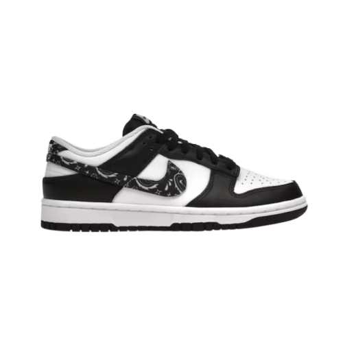 The Nike Dunk Low Essential Paisley Pack Green W is part of the Dunk Low Paisley Pack released by Nike Sportswear for 2022. This version of the Nike Dunk Low features a white leather base with green leather overlays, laces, insoles, rubber outsole, and nylon tongues. Its most notable features are its bandana print swoosh logos and heel tabs. For increased grip, this sneaker features designed patterns beneath its outsole, whereas it features a perforated toe box to increase its breathability.